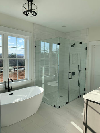One of your glass shower panels turns at a right angle. The door can either be hinged from a wall or from another panel of glass or be a sliding door.